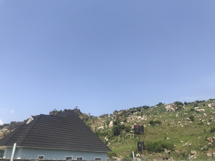 The image depicts a daytime scene in Bwari, Nigeria, characterized by a clear, bright blue sky overhead. In the lower left quadrant, a segment of a light blue/grey building with a dark grey corrugated pyramidal roof is visible. A security fence topped with barbed wire runs along the base of the visible structure. To the right, a rocky hillside ascends, covered in sparse green grass, scattered shrubs, and numerous large, light-colored boulders. Positioned on the lower slope of this hill is a metal tower, likely a water tank stand, supporting two dark-colored cylindrical tanks. The hill extends into the background, showcasing additional rocks and vegetation, with a small cluster of trees visible at a distant peak. No individuals or specific actions are discernible within the frame.