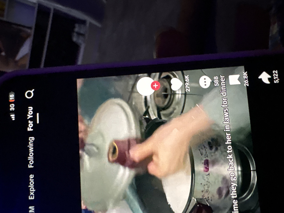 A person is watching a TikTok video on their phone. The video shows someone cooking, lifting the lid off a pot on a stove. The TikTok interface is visible with options like "Explore," "Following," and "For You." There are also like, comment, and save icons with associated numbers indicating engagement. The video's caption reads, "time they go back to her in laws for dinner."