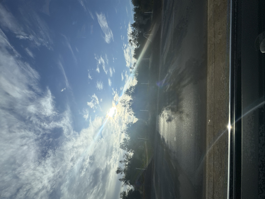 The image depicts an outdoor scene in Majjate, Morocco, captured from inside a vehicle. The upper half of the frame is dominated by a clear blue sky with scattered white clouds, ranging from wispy cirrus to more diffused formations. The sun, partially obscured by clouds, is positioned in the upper right quadrant, emitting strong lens flares that extend diagonally across the frame. Below the sky, a dense line of green trees and foliage forms the horizon. Interspersed within or behind the trees are multiple light-colored, vertical structures resembling fence posts. The ground immediately below the treeline consists of a dark, wet paved surface, likely a road or large lot, reflecting the sunlight and exhibiting areas of standing water. Long, dark shadows are cast across this wet surface, originating from the left and extending towards the right, consistent with the sun's position. The very bottom of the image shows a dark, horizontal surface, presumably a vehicle dashboard or window frame, with a distinct sun glare visible on its edge. No people or animals are present.