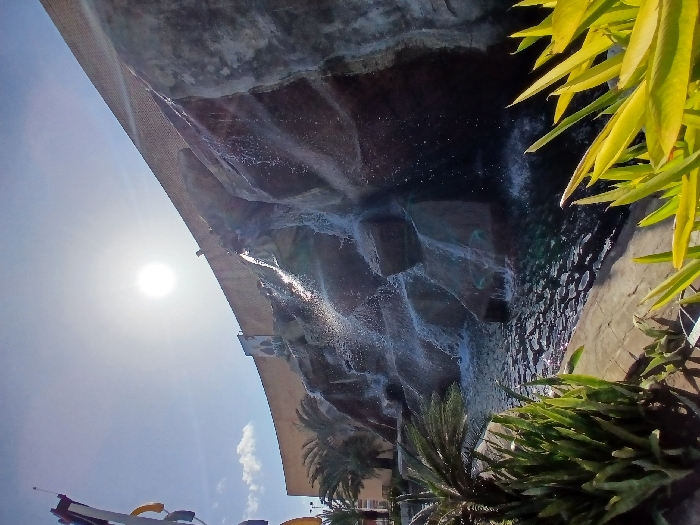 Sunlight illuminates a high rock wall with flowing water. A dark pool sits at the base. The sky is clear, transitioning from blue to white around the sun. Palm trees and various green plants grow near the wall's base and sides. Below the wall, partially visible, are structures that suggest a water park or recreational facility.