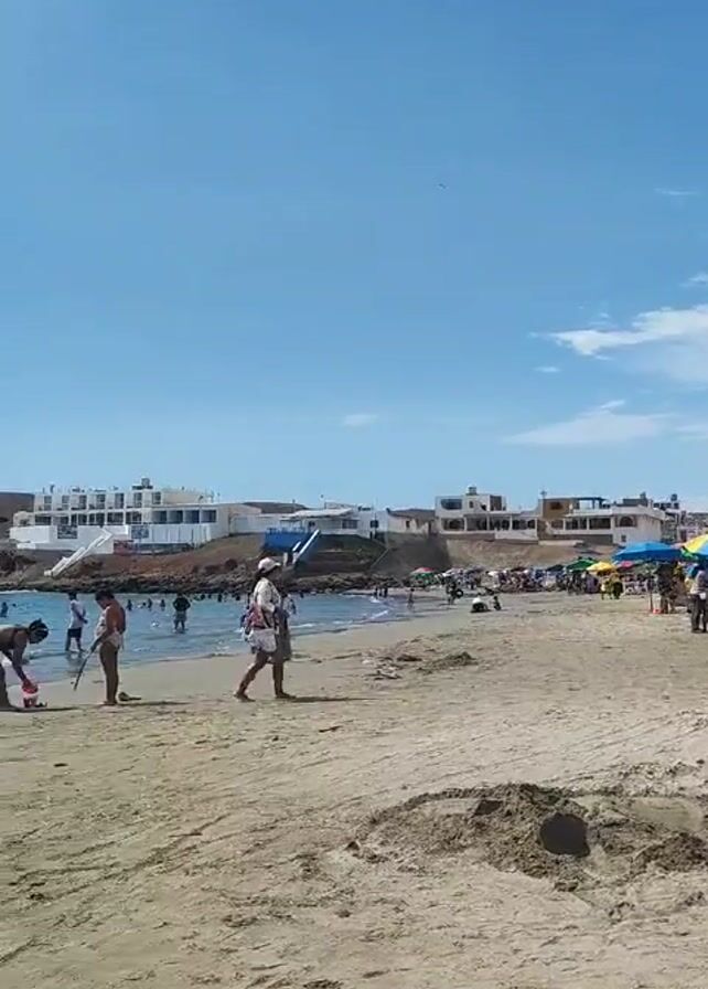 beach scene on a sunny day. The sky is blue with a few white clouds. The beach has light brown sand. In the background, there are white buildings lining the beach. People are walking and wading in the water along the shoreline. Some people are standing in the water up to their knees. There are several beach umbrellas visible in the distance, some are yellow and blue striped. The camera view is partially obscured by a blue fringed object at the top of the frame. The waves are small.