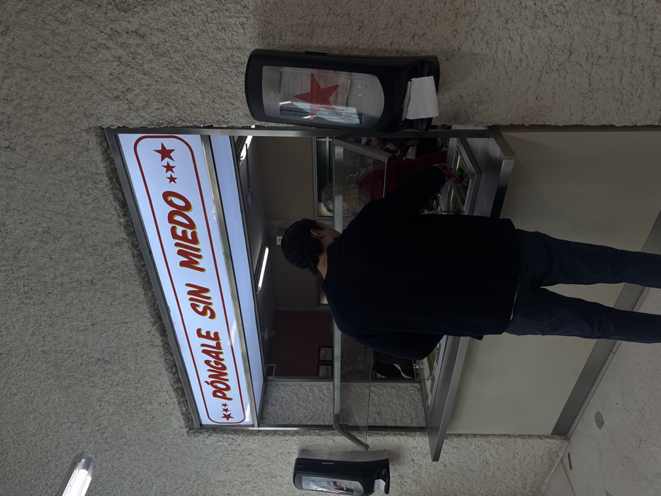 A person stands at a food stall with a sign that reads "PÓNGALE SIN MIEDO," decorated with stars. The stall is framed by metal. The person is wearing a black shirt and dark pants. Above and below the stall are napkin dispensers with a red star inside. The background features a textured wall and a plain wall inside the stall.