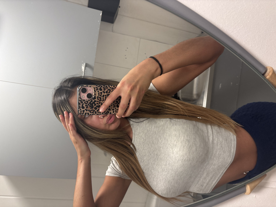 In a mirror selfie, a woman angles her phone, obscured by a leopard-print case, to capture the shot. She wears a cropped grey t-shirt, revealing a glimpse of her midriff and navel piercing. A dark-colored bottom hugs her hips. Her long, highlighted brown hair falls over her shoulder. A black hair tie encircles her wrist. The background features a bathroom setting with a stainless steel sink and white tile walls. The mirror’s frame adds a slightly distorted perspective to the overall image.