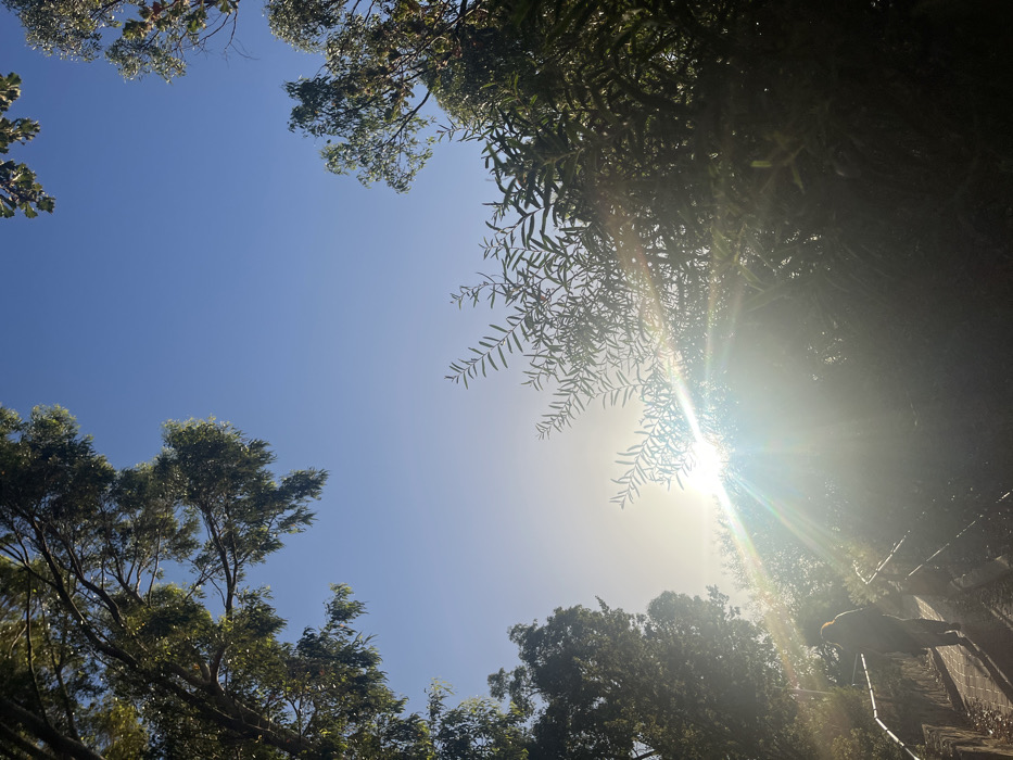 The image depicts an outdoor scene in Applecross, Australia, characterized by strong backlighting from a low sun. A single individual walks away from the viewer on a paved pathway in the lower-left quadrant. The person is dressed in dark clothing and has light-colored hair. To the left of the pathway, a low stone wall with a dark metal handrail is visible. Dense green foliage, including trees with eucalyptus-like leaves and smaller shrubs, frames the scene, particularly in the upper and right portions of the image. The sun, positioned in the middle-lower section, emits bright light and prominent lens flares, partially obscured by foreground leaves. The sky is clear blue at the top, gradually lightening towards the horizon due to atmospheric haze and the sun's brilliance.