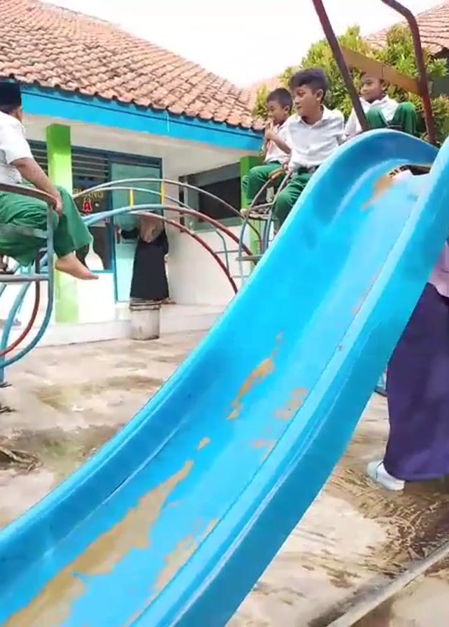 school playground with children playing on different equipment. A blue slide is in the foreground, and further away, several boys wearing white shirts and green pants are on a merry-go-round. A girl in a purple skirt and white shoes is standing near the slide, and in the background, an adult wearing a black hijab is visible. Another boy, wearing a purple outfit and carrying a red backpack, walks toward a metal slide. The playground is tiled, and the buildings around have tiled roofs, suggesting a school environment.