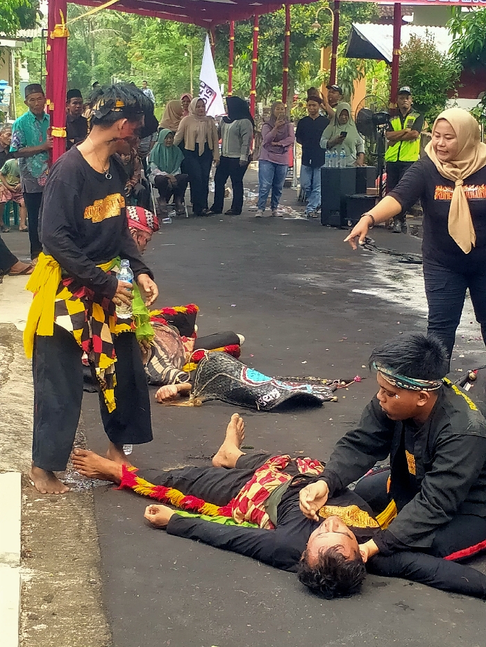 An outdoor scene in Pojok, Indonesia, depicts a performance or event on a dark asphalt surface, partially wet. In the foreground, three males are central. One male lies supine on the asphalt, barefoot, wearing a black long-sleeve shirt and dark pants, with red and yellow patterned fabric draped across his midsection and legs. His eyes are open. Adjacent to him, a second male kneels, also in a black long-sleeve shirt and dark pants, with a blue and white patterned headband; he is touching the chest area of the supine individual. Standing to the left, a third male, barefoot, wears a black long-sleeve shirt, dark pants, a yellow sash, and red/yellow/black patterned fabric. His face shows dark markings or paint, and his hair contains dark, leafy elements. He holds a clear plastic water bottle. On the ground near the prone figures are costume elements, including a black piece with blue markings and other patterned fabrics. In the mid-ground, a woman wearing a black t-shirt with "PUNOKAWAN PONOROGO" visible text and a tan hijab points her right arm forward. To her left, black sound equipment is visible. In the background, under a red canopy, a diverse group of approximately 10-15 spectators observe the scene. One individual in the background wears a green safety vest, and a white flag with red lettering is partially visible. Green foliage and trees are present in the distant background.
