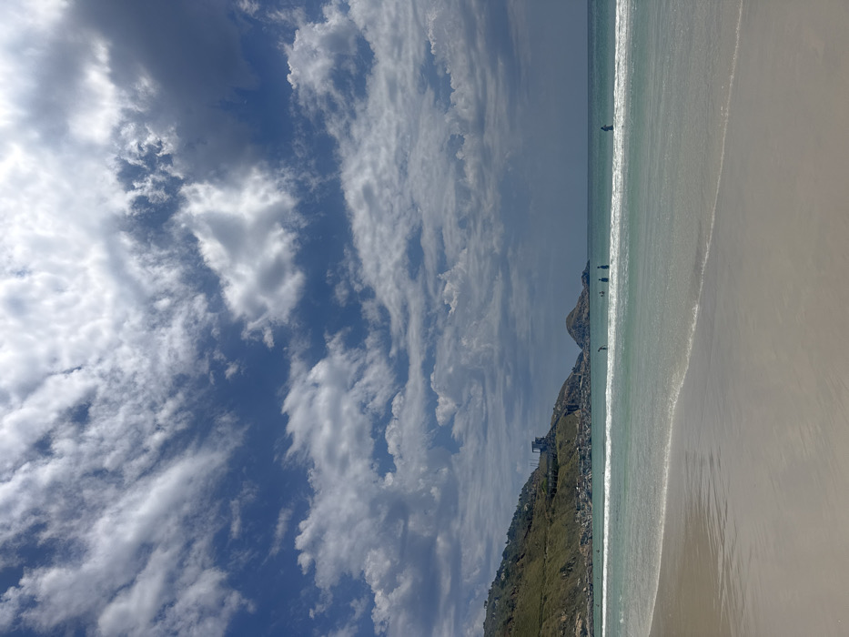 A sunny beach scene shows a wide sandy shore meeting a calm, clear ocean. Wispy clouds fill the blue sky above. A green, rugged hill rises from the edge of the beach. Several indistinct figures appear in the water, possibly swimming or wading. The image is taken from a low angle, emphasizing the expansive sky and beach.