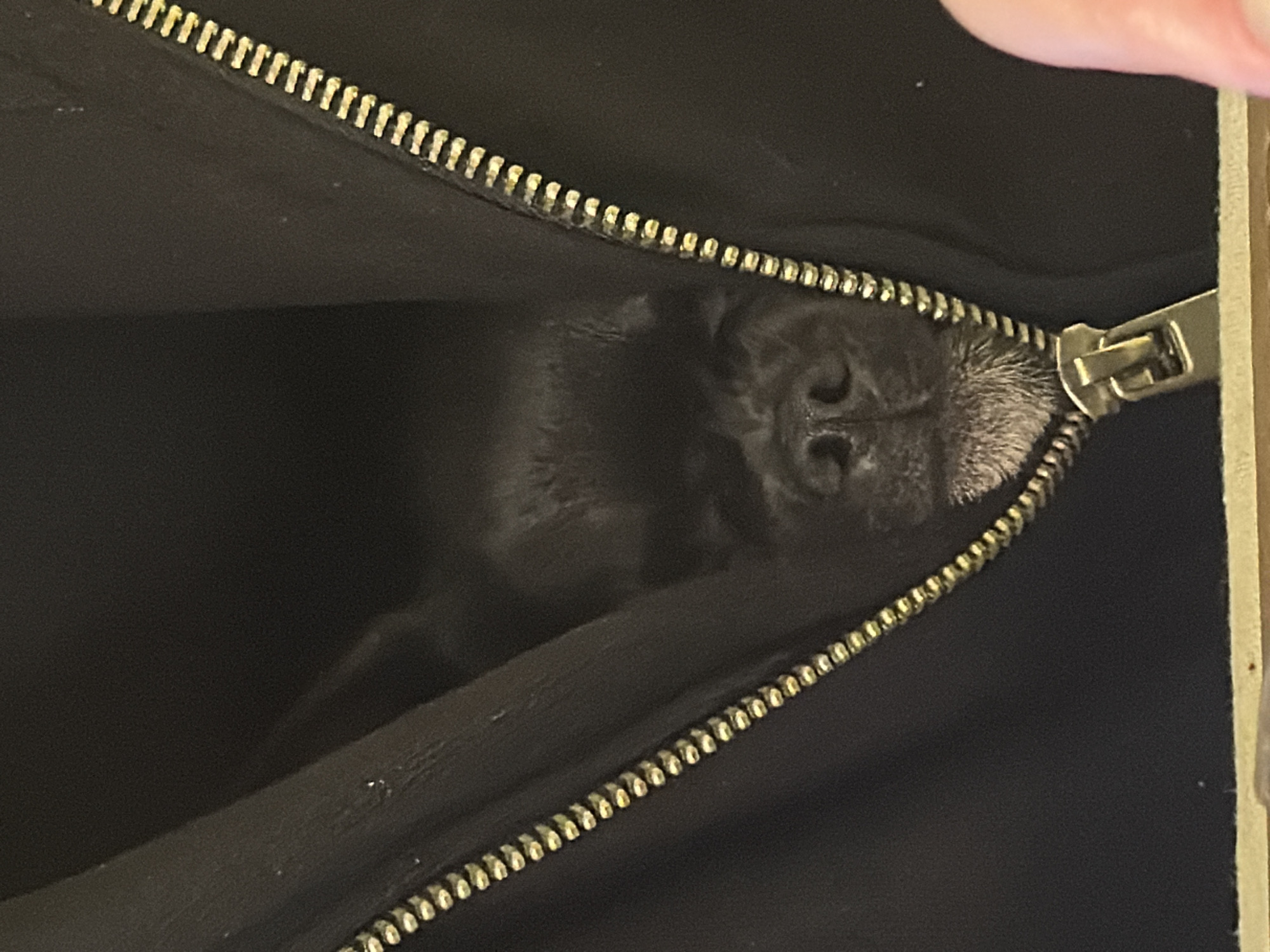 The scene depicts a dark-furred canine's face emerging from a partially zipped, black garment in Boreti, Montenegro. The canine, a brachycephalic breed, is observed with its eyes closed or obscured by shadow, presenting a prominent dark snout and muzzle area with a distinct patch of lighter, possibly gray, fur around its chin, resembling a goatee. A metallic, brass-colored zipper runs vertically through the center of the image, outlining the opening from which the dog's face is visible. The zipper's pull tab is situated at the bottom, indicating the zipper is partially closed. The surrounding fabric of the garment is uniformly black. A blurred, light-toned human digit is partially visible in the lower right corner, and a faint, light-colored horizontal edge marks the very bottom of the frame. The lighting is low, highlighting the dog's features against the dark fabric.