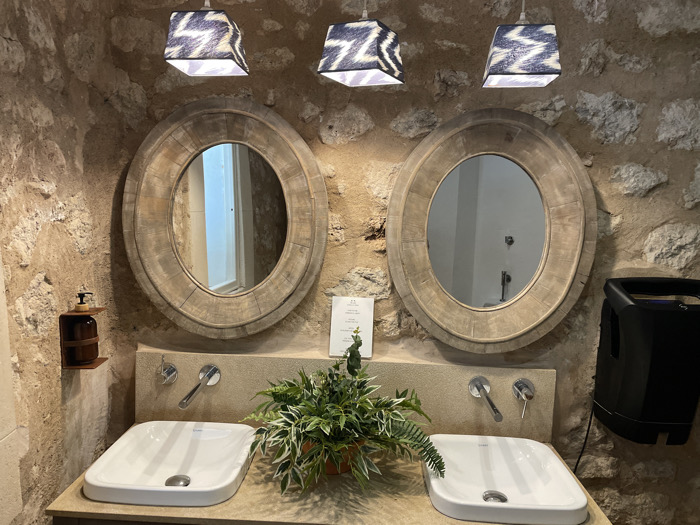 This image displays a washroom interior located in Bunyola, Spain. The walls are constructed from exposed, irregular stone blocks. Three square-shaped pendant light fixtures, each featuring a blue and white zig-zag pattern, are suspended from the ceiling. Below these lights, two identical oval mirrors with thick, textured wooden frames are mounted side-by-side on the stone wall. A light-colored stone countertop extends across the lower portion of the wall, supporting two white, rectangular-oval surface-mounted washbasins. Each basin is equipped with a wall-mounted chrome faucet featuring a single lever. Centered on the countertop between the basins is a potted plant with green and white variegated leaves. To the left of the left mirror, a dark brown pump-dispenser bottle, likely containing soap, rests on a small brown shelf affixed to the stone wall. A small white sign is visible on the stone wall between the two mirrors, above the plant. To the right of the right mirror, a black wall-mounted electronic device, resembling a hand dryer, is installed on the stone wall. The reflections in the mirrors show glimpses of an interior space, potentially a doorway. No individuals are present in the scene.