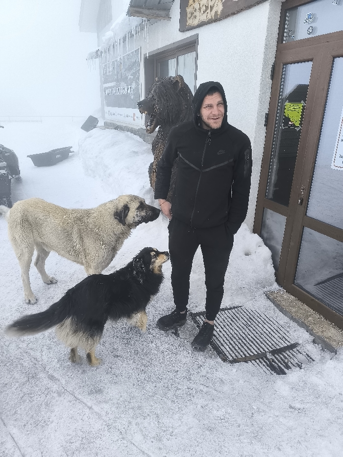 The image depicts an outdoor winter scene in Panichishte, Bulgaria. A male individual stands centrally on a snow-covered, icy ground near the entrance of a light-colored building. He is wearing a black Nike hooded track jacket, black track pants, and black shoes, with his hands in his pockets, smiling and looking slightly to his right. To his left stands a large, light-colored dog with cream/tan fur, facing towards the right. Directly in front of the man, a medium-sized dog with long black fur on its back and head, and lighter brown/tan fur on its legs and underbelly, stands looking upwards towards the man with its mouth slightly open. Both dogs' fur appears to have some snow adhering to it. The building, constructed of a white stucco-like material, features a brown-framed glass door to the right of the man and a window to his left. Icicles hang from the roof overhang above the window. Below the window, a sign is partially visible, displaying "PANICHESHTE" and other text. Two large, dark wooden carvings, resembling bears, flank the lower part of the building wall next to the door. A black entrance mat or grate is visible directly at the threshold of the door, partially covered by snow and ice. In the left background, beyond the dogs, a dark-colored sled or similar winter equipment rests on deep snow. The overall environment is characterized by heavy snow cover and limited visibility due to fog or overcast conditions extending into the distant background.