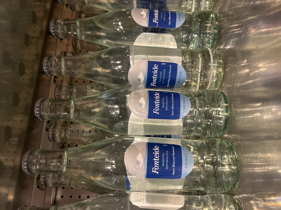 row of six glass bottles of “Fonteide” mineral water, on a stainless-steel shelf