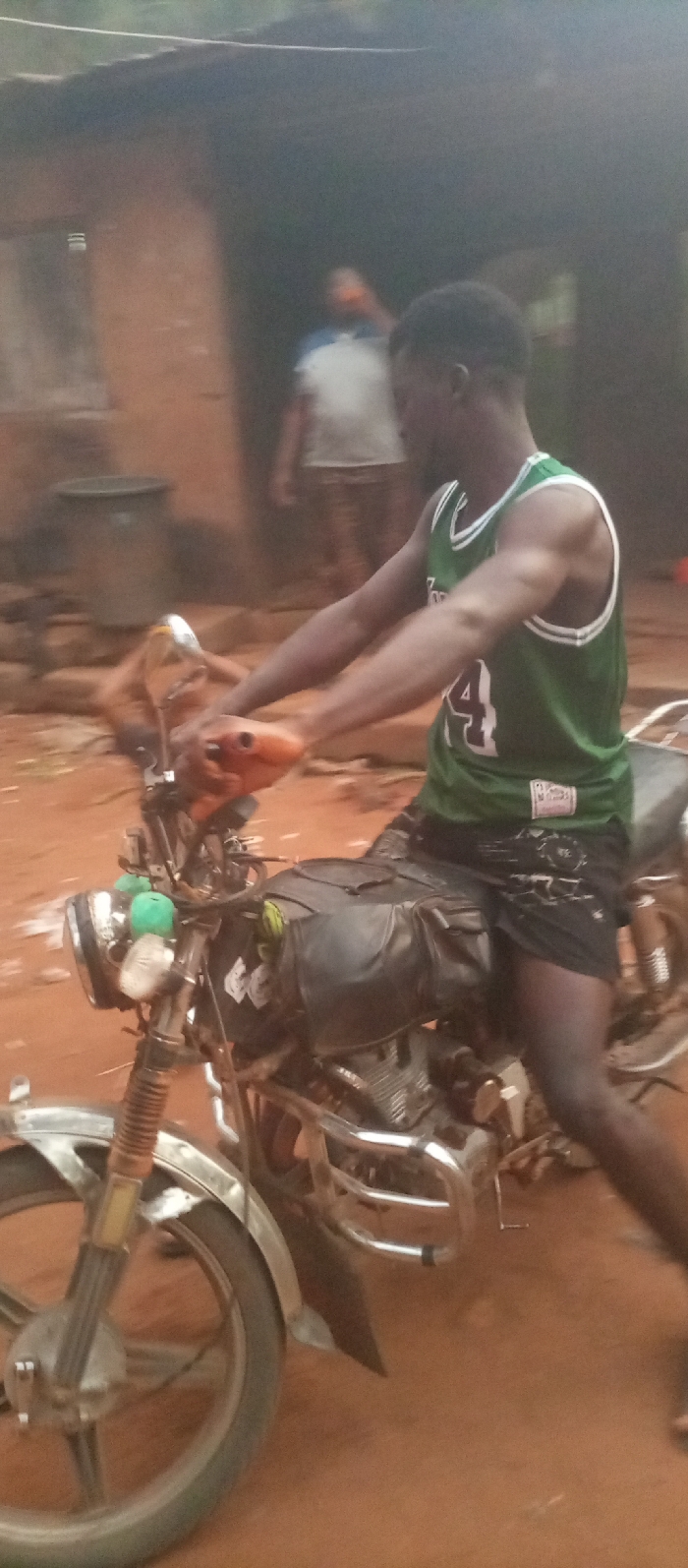 An African man in a green jersey with the number 24 is sitting on a motorcycle on a dirt road. The motorcycle has a black bag on the gas tank. In the background, there is a person standing in front of a house with a bucket. The image is somewhat blurred, suggesting movement or a low-quality camera. The ground is reddish-brown dirt, typical of rural areas.