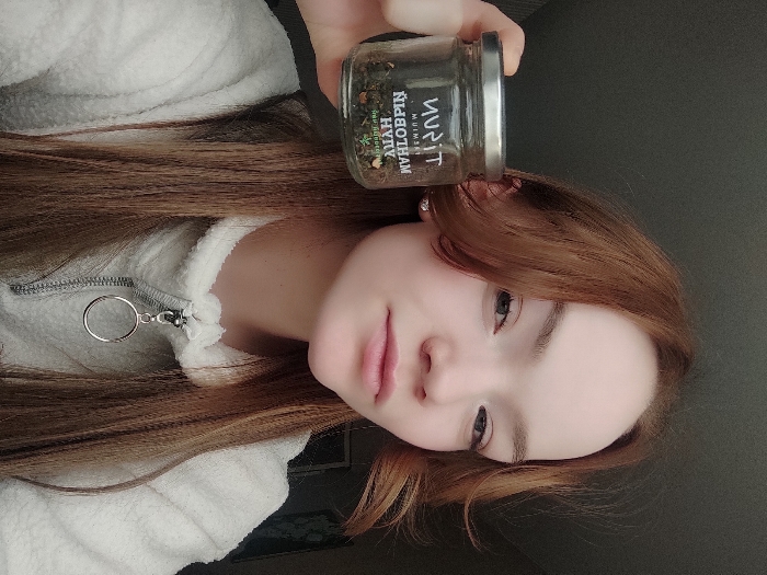 A young female, appearing to be in an indoor setting within the city of Марковский, Russia, is depicted in a medium close-up. Her specific location within the city is indeterminate. She has long, reddish-brown hair, styled with bangs, and a fair complexion. Her light-colored eyes are directed towards the camera with a neutral expression. She is wearing a light-colored, possibly off-white, fleece-textured garment featuring a silver-toned zipper with a circular ring pull. A small, light-colored earring is visible on her left earlobe. In her left hand, positioned near her face, she holds a transparent glass jar with a silver-colored metal lid. The jar contains dried green and brownish botanical material. The label on the jar displays text, partially reversed, including "TISUN PREMIUM" and "МАЙЛОБИН". She is presenting the jar towards the viewer. The background is dark and indistinct, lacking specific environmental identifiers.