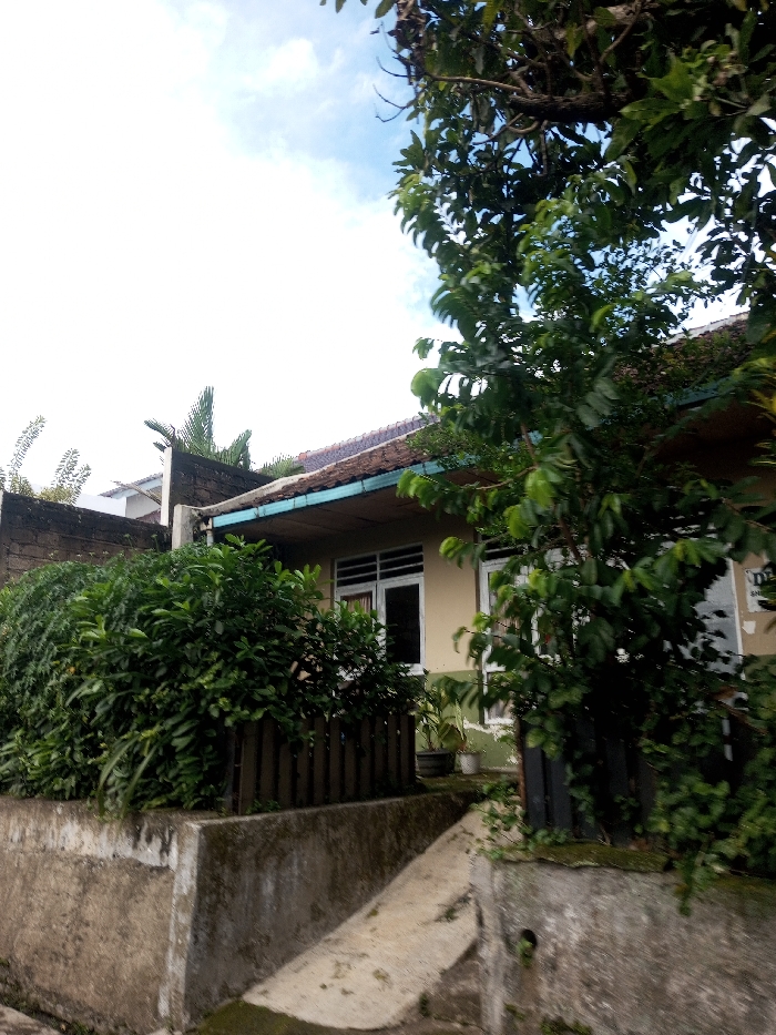 A single-story house sits nestled amongst lush greenery. The house, painted a light shade, has a dark, possibly tiled, roof. White-framed windows offer glimpses into the interior. A concrete wall and a partially obscured fence line the edge of the property, giving way to steps leading up to the house. Overhanging tree branches dominate the right side of the frame, with vibrant green leaves filling the view. The sky above is a mix of white and light blue.