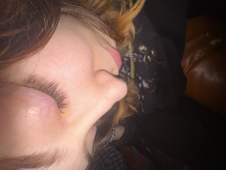 The scene depicts a close-up, overhead view of an individual's face and upper torso, located in Stara Zagora, Bulgaria. The subject is a person with brown hair exhibiting lighter undertones or highlights. The right upper eyelid (viewer's left) is markedly swollen, hyperemic, and appears inflamed. Prominent vascularization is visible on the affected eyelid tissue. A small, yellowish lesion, consistent with a pustule or accumulation of discharge, is present along the lash line of the swollen eyelid. The subject's eyelashes and eyebrow are dark. The nose is prominent in profile, and the lips are visibly reddened and slightly parted. The skin on the visible cheek area is fair and exhibits minor freckling. The individual is wearing a dark-colored garment with a graphic design on the chest. A multi-beaded bracelet, consisting of silver-toned spherical beads, is visible on the left wrist or forearm. The background consists of a dark, indistinct patterned surface to the left and a plain, reddish-brown, possibly upholstered, surface to the lower right. Lighting is subdued.