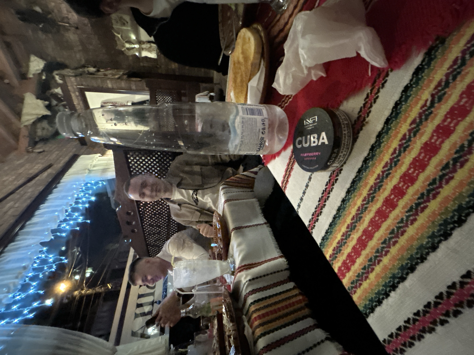 The image depicts a dinner scene in what appears to be a traditional Bulgarian restaurant. Two men are visible at the table, one partially in focus and the other more clearly seen, both fair-skinned and with short hair. The table is covered with a striped tablecloth featuring traditional Bulgarian patterns in colors like red, yellow, and white. On the table, there is a plastic water bottle, a container of what appears to be tobacco ("CUBA" brand), and a piece of bread. In the background, there are decorative lights, possibly indicating an outdoor or covered patio area. Given the traditional setting and the presence of Bulgarian patterns, it is probable that the location is a restaurant serving Bulgarian cuisine in the city of Sofia, Bulgaria. People are eating, drinking water, and interacting at the table.