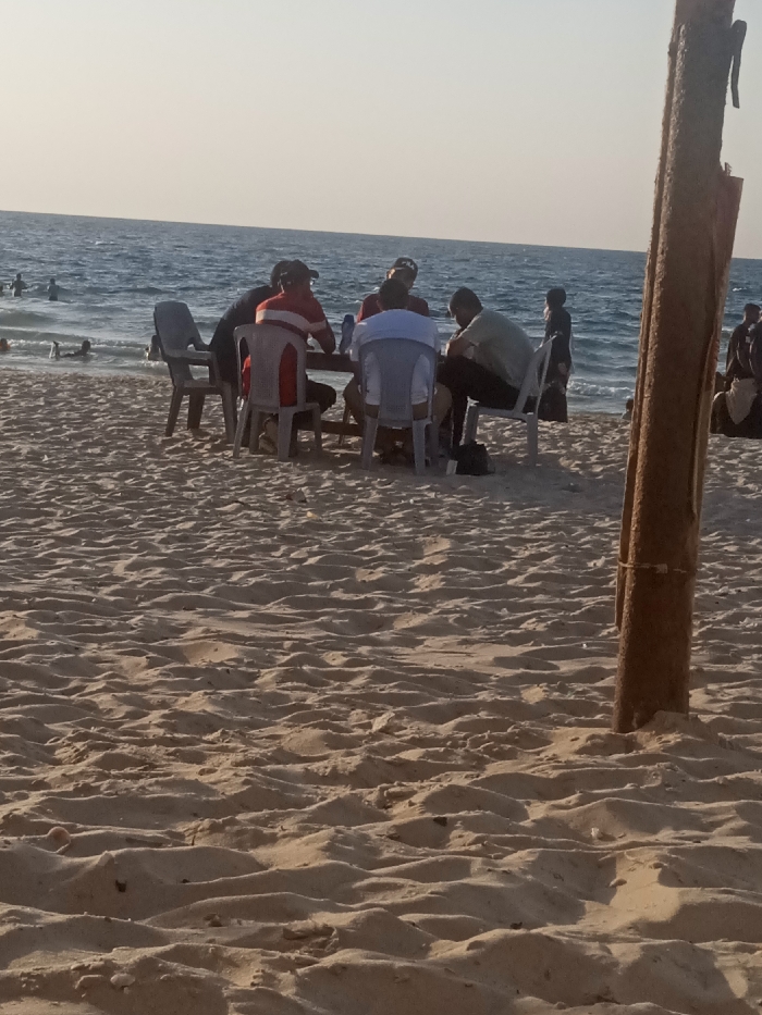 The image depicts a beach scene in Al-Mawasi, Palestinian Territories