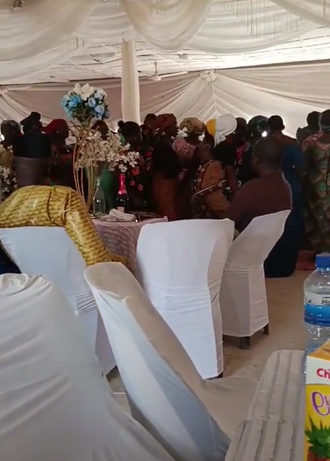 interior of a wedding reception hall with white draped fabric covering the ceiling. Guests are mingling, dancing, and sitting at tables covered with white cloths and white-covered chairs. Several tables have centerpieces with flowers and bottles of beverages. A small stage is visible at the far end of the hall, decorated with white and lavender drapes. A single person sits on an ornate white chair on the stage.