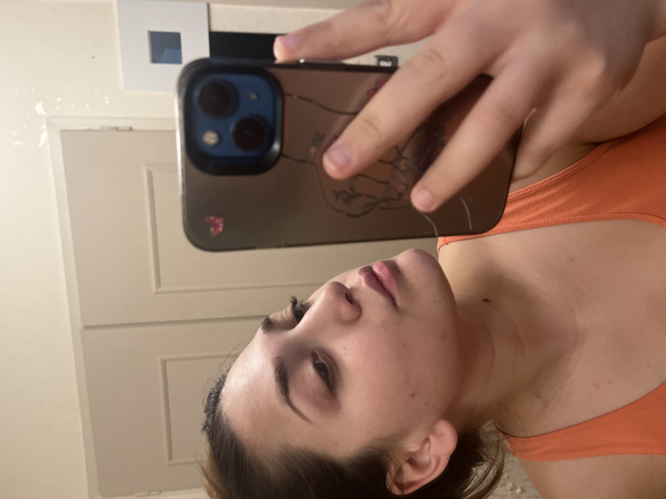 The image depicts an indoor mirror selfie of a single individual. The individual, appearing to be a light-skinned female with dark hair, wears an orange tank top and has her head tilted slightly to her right, with her gaze directed towards the camera/mirror. Her lips are slightly parted and appear glossed. She holds a dark-colored smartphone, consistent with an iPhone featuring a dual-camera system, in her left hand. The phone case exhibits a cracked lower-left corner and features a line art depiction of a hand, along with a small red butterfly sticker on the upper-left of the case. The background consists of a light-colored, possibly off-white, wall or door structure, and to the right, a white square fixture mounted on the wall containing a smaller, dark, reflective square insert. The exact location within Rennes, France, cannot be determined from the visual evidence presented in the image.