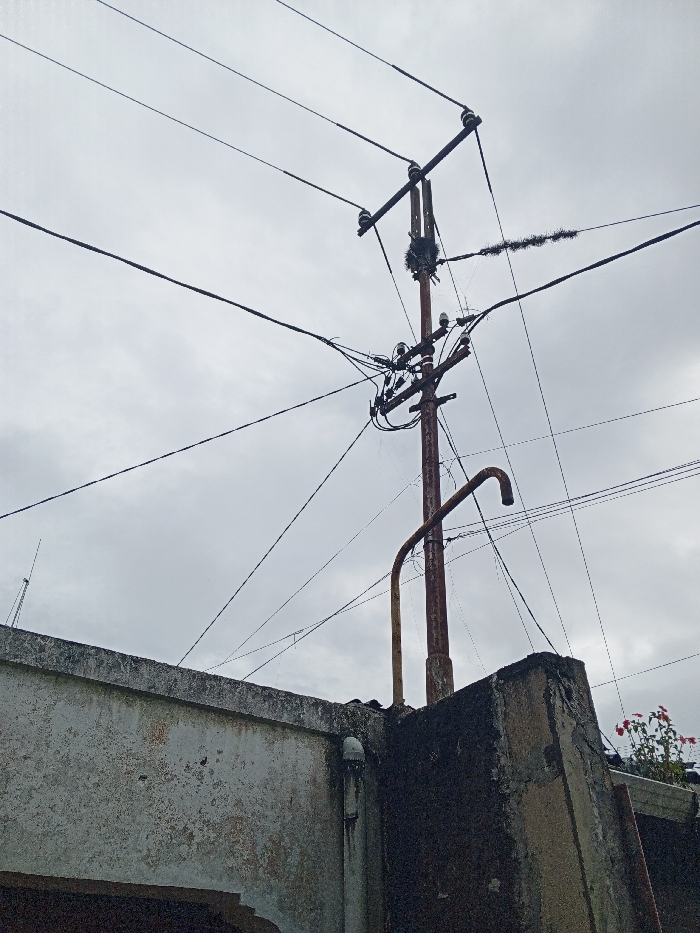 A utility pole stands against a cloudy sky, topped with power lines and what appears to be a bird's nest. A rusty pipe curves from the pole down to a concrete wall, overgrown with moss and discoloration. A section of the wall is painted in white, showing signs of age and deterioration. Red flowers peek out from behind the wall to the right.