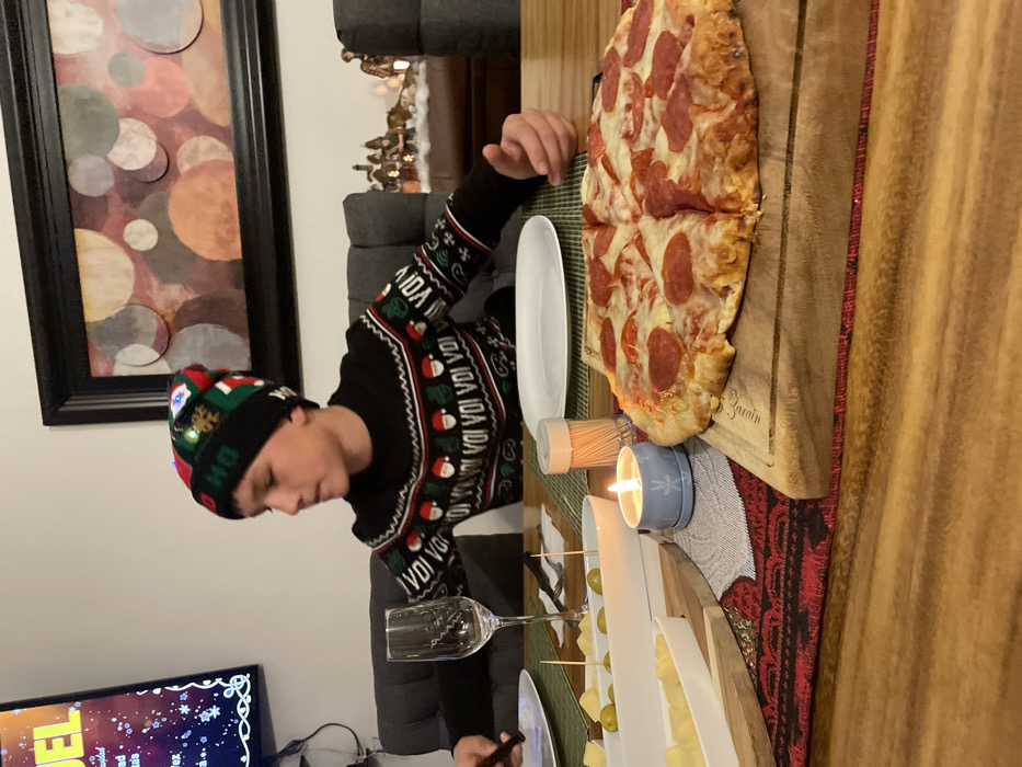A boy in a Christmas sweater and light-up hat stands at a table set for a holiday meal. A large pepperoni pizza sits on a wooden board. Toothpicks in a container, a lit candle, and a dish of olives are nearby. A wine glass is positioned near the boy. A painting hangs on the wall, and the edge of a television screen is visible in the bottom left corner.