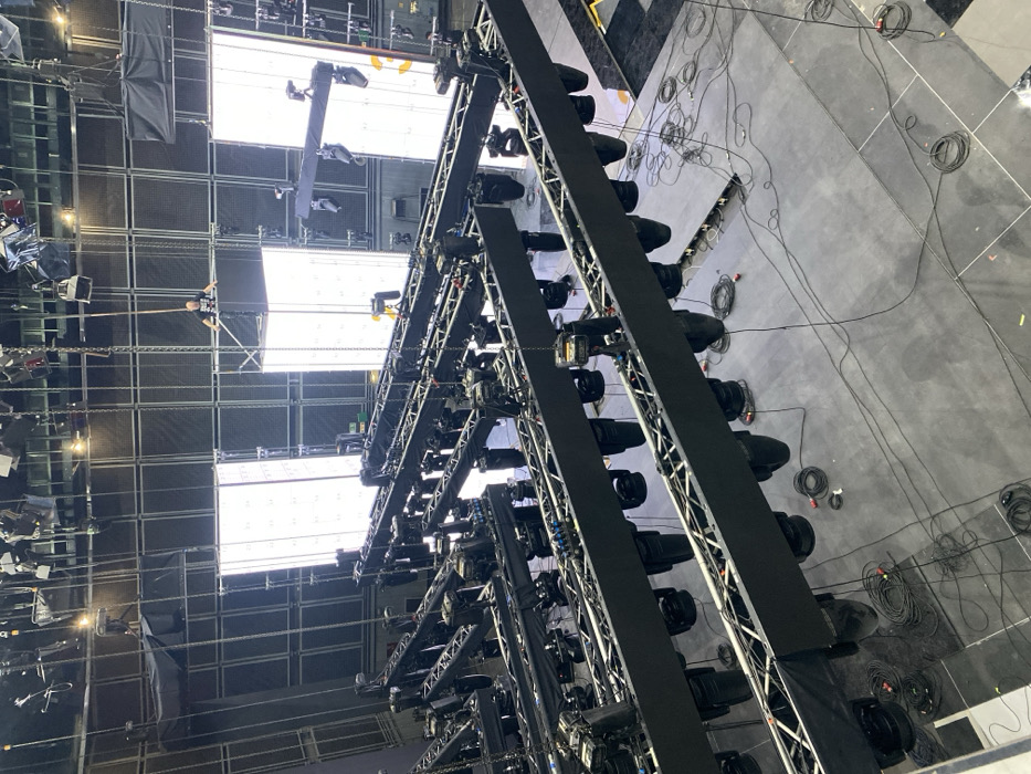 This image depicts a large indoor television or event studio, specifically located in the Cukarica Urban Municipality, Serbia. The scene is dominated by extensive stage lighting and production equipment, viewed from an elevated perspective. In the foreground and midground, several parallel rows of black metal truss structures span horizontally across the space. These trusses are heavily populated with numerous professional stage lighting fixtures, including moving head and wash lights, suspended downwards. Black electrical cables are coiled and strewn across the dark grey floor beneath and around these truss systems. In the background, three prominent, brightly illuminated vertical structures, identified as large LED video panels or light boxes, form part of a stage setup. A single bald male individual, wearing a dark t-shirt, stands on a raised platform positioned between two of these illuminated panels. He is observed facing towards the foreground equipment. To the upper right, a camera jib or crane, equipped with lights, extends horizontally. The studio features high ceilings with a visible grid of overhead rigging and additional lighting fixtures. The walls exhibit a dark, textured appearance, possibly acoustical treatment. The floor is a dark grey, industrial surface with visible markings and darker sections.