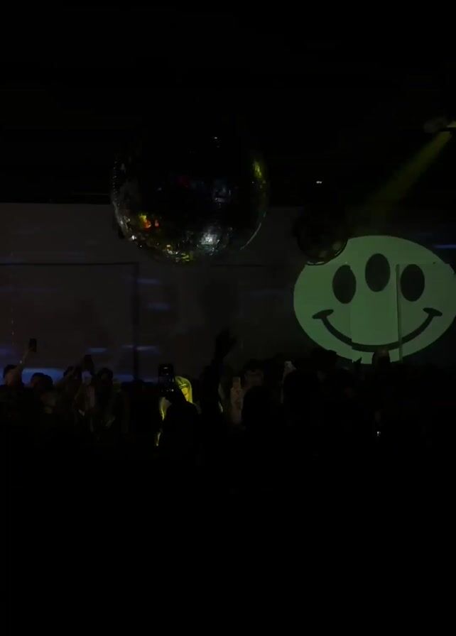 crowd of people at a nightclub or concert. There's a disco ball spinning from the ceiling and a large screen projecting a green smiley face with three eyes. Some people are holding up their phones, recording the event. Strobe lights flash intermittently across the crowd. Many people are dancing with their hands in the air.