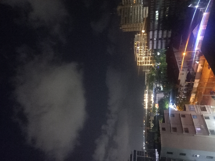 A nighttime cityscape under a cloudy sky. Tall buildings, some illuminated, line the view. Streetlights create a golden glow along the roads. The sky is mostly dark with patches of white clouds, suggesting either dusk or the beginning of night. The image is rotated counter clockwise.