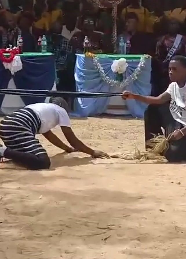 performance taking place in a large outdoor sandy area, possibly a schoolyard or community event. In the foreground, a woman in a white t-shirt and black-and-white striped leggings is on her hands and knees, apparently about to crawl under a black ribbon held taut by two individuals. To the left, a man wearing traditional African clothing holds one end of the ribbon, and to the right, a young man in a white t-shirt and black pants holds the other. They appear to be focusing on the woman as she prepares to crawl. Behind them, a stage area is set up with tables draped in blue cloth and decorated with flowers and tinsel. A large tent-like structure provides shade over the stage. A large audience is seated behind the stage, watching the performance. In the immediate foreground, two individuals are squatting and taking photos or videos of the performance with their mobile phones. The setting is sunny and outdoors, with a building featuring a rusty corrugated iron roof visible in the background. The scene suggests a cultural event, competition, or performance.