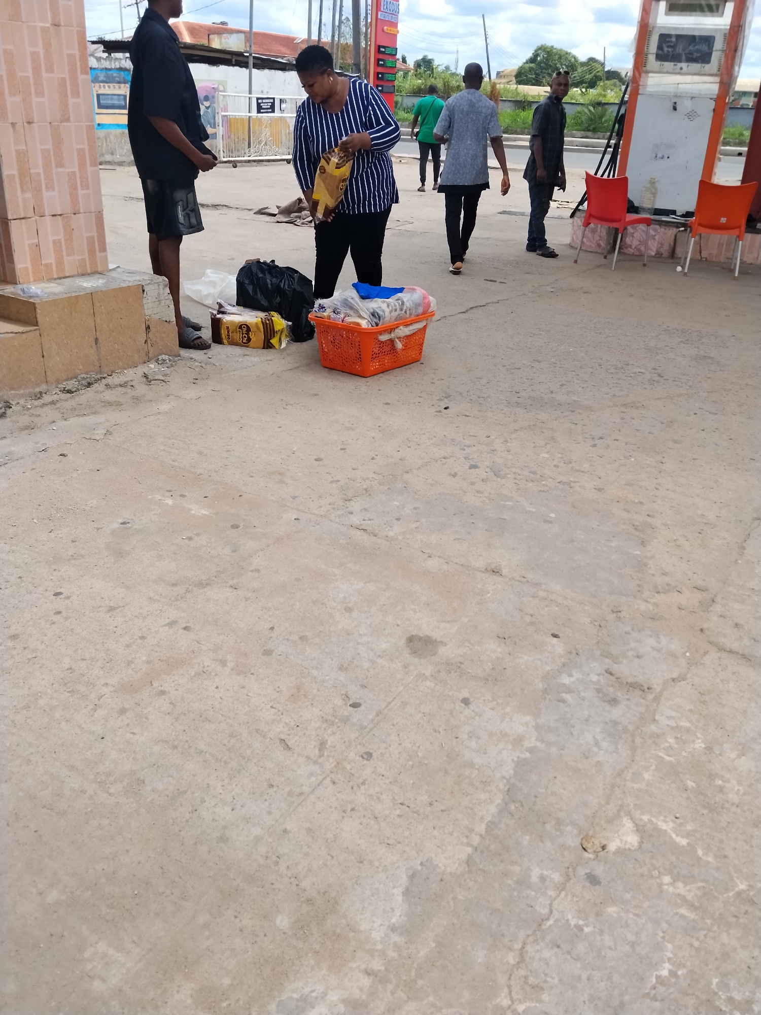 A daytime scene in Aba, Nigeria, shows a street-side area, likely a gas station or shop forecourt