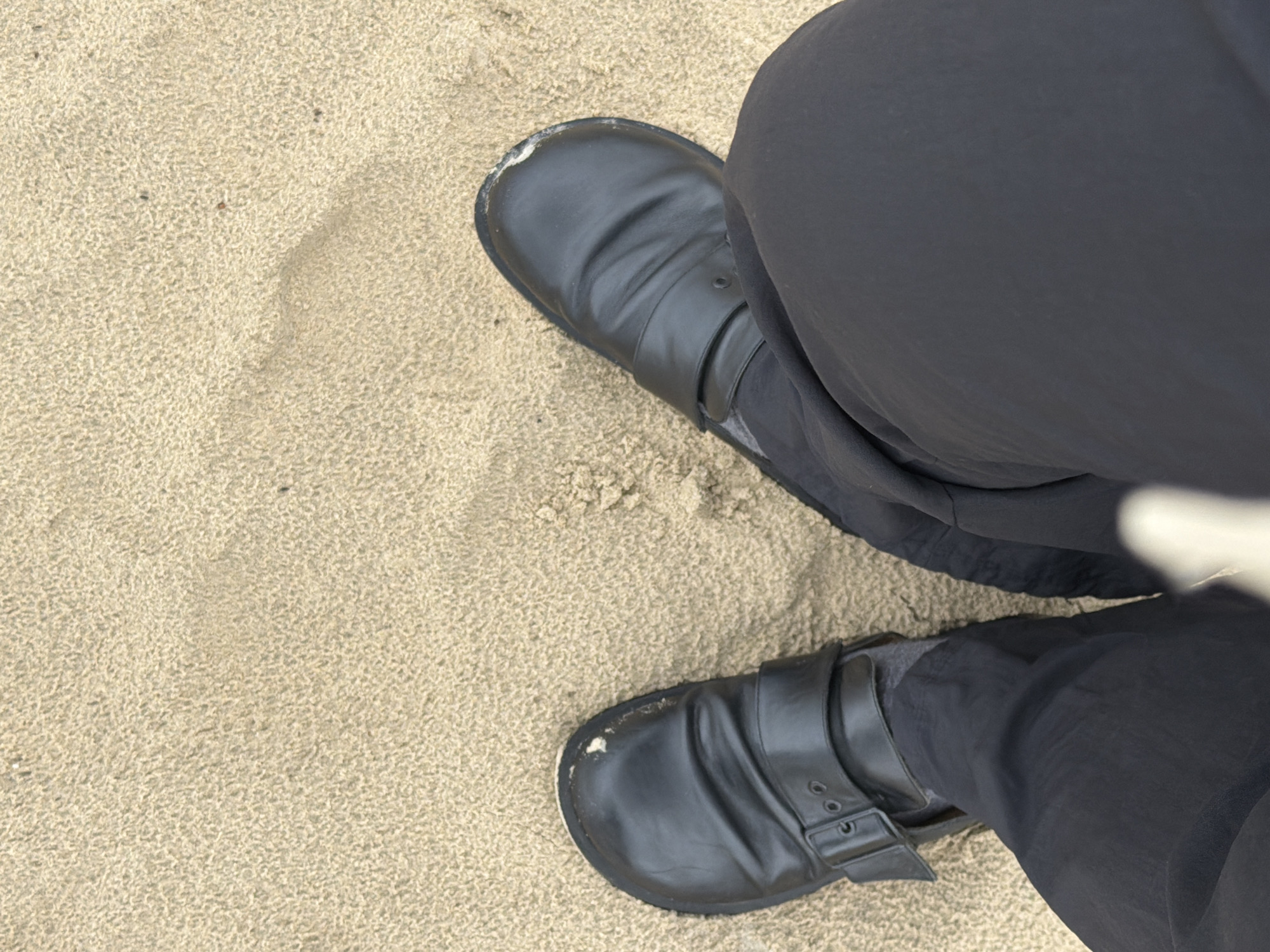 - "A first-person perspective image shows a pair of black shoes on light brown sand" by FM-6wypx2, licensed under CC BY 4.0