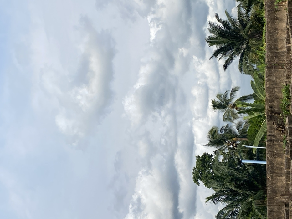 A cloudy sky dominates the frame, with varying shades of gray and white. Lush greenery, featuring palm trees and banana leaves, occupies the right side of the image. A decaying concrete structure runs vertically along the edge, adding a rustic texture. A thin, blue object is seen in the distance. Overall, the scene captures a contrast between the natural beauty of the vegetation and the aged man-made construction under a dramatic sky.