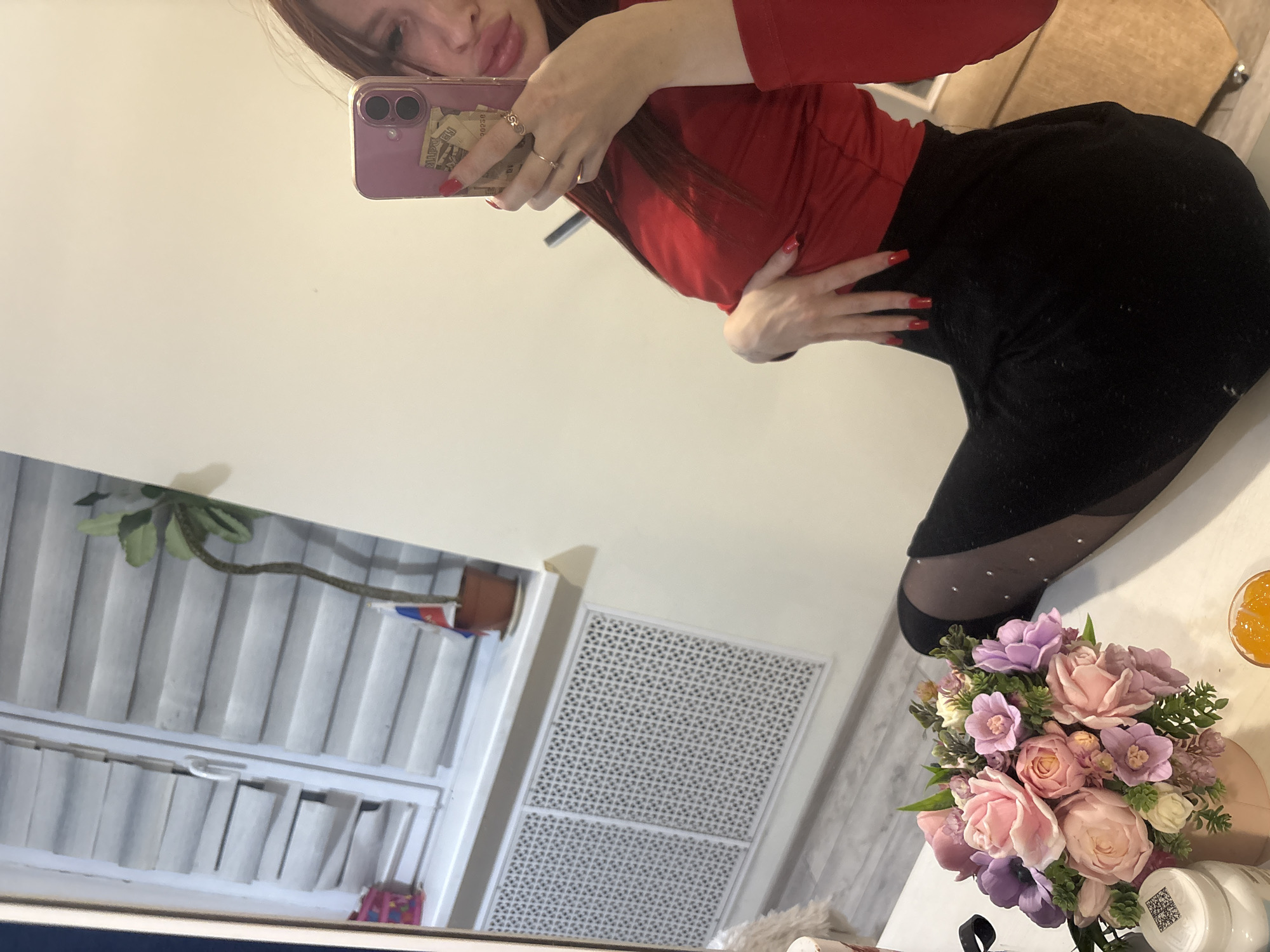 A woman in a red top and black skirt is taking a selfie in a mirror. The mirror reflects a window with closed blinds, a decorative vent, and a bouquet of flowers. A glass of orange liquid sits near the flowers. There is no evidence of the city of Simferopol, Ukraine.