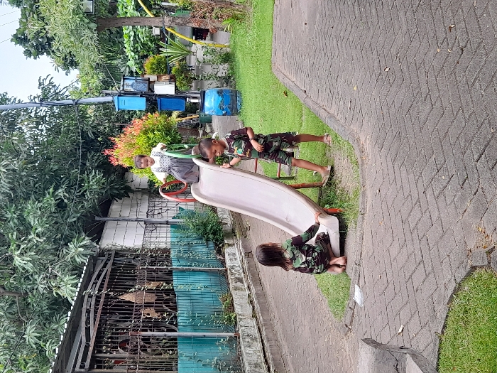 Three children are playing on a playground in Kecamatan Sidoarjo, Indonesia. One child, a girl wearing a grey dress, is on the top of a slide. Another child, a girl wearing a camouflage shirt and black pants, is standing at the bottom of the slide. The third child, a boy wearing camouflage shorts and a shirt, is standing on the ground next to the slide. There is a blue and white recycling bin in the background, a green metal fence, and trees. The ground is made of concrete pavers. The location is a public playground in Kecamatan Sidoarjo, Indonesia. The coordinates are latitude: -7.441, longitude: 112.705.
