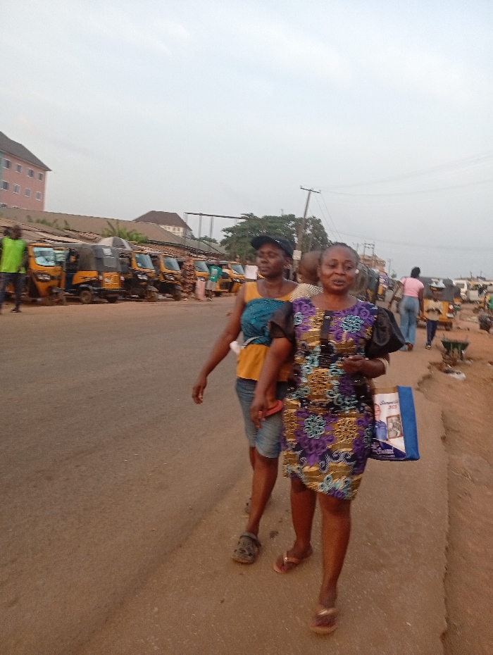 Two women stroll along a roadside in an urban setting. The woman in the foreground wears a floral print dress and carries a shopping bag. Her companion dons denim shorts, a tank top, and a black cap. In the background, a row of yellow auto rickshaws are parked along the street. Buildings and utility poles are visible in the distance, set against an overcast sky. Other individuals are scattered along the roadside, contributing to the bustling street scene.