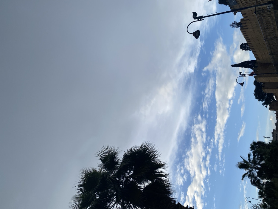 The image displays an exterior urban landscape in Fez, Morocco, observed from a low angle. The upper two-thirds of the frame are dominated by a sky exhibiting a transition from a pale grey, largely overcast upper left quadrant to a blue expanse with numerous scattered white clouds, primarily stratocumulus and cirrus formations, stretching horizontally across the mid-section. A prominent, dark green palm tree, silhouetted against the sky, occupies the upper left. In the lower right quadrant, a significant section of a light-brown or ochre-colored fortified wall is visible, characterized by crenellated battlements along its top and decorative horizontal masonry details along its face. Two black streetlights with curved poles and circular luminaires are present; one stands tall in the far right, silhouetted against the sky and wall, while a smaller one is positioned further left, also silhouetted above the wall. Additional dark silhouettes of palm trees and other dense foliage, possibly cypress trees, are scattered along and behind the wall, with a flagpole bearing a red flag discernible near one of the streetlights. The scene is devoid of human presence or activity.