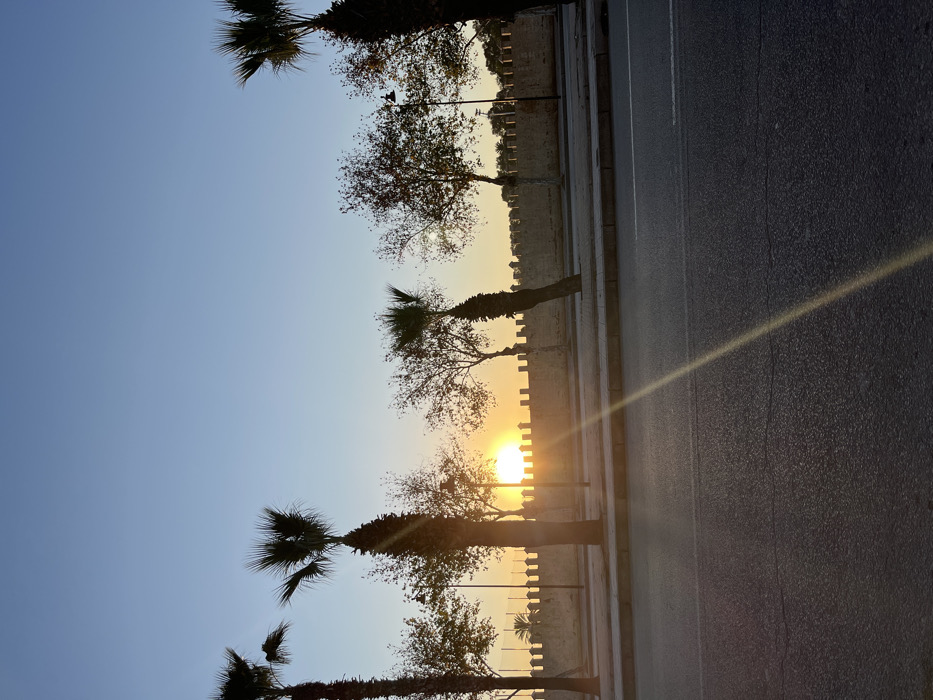 A sunlit landscape features a row of palm trees and leafy trees silhouetted against a pale sky. The sun, positioned low on the horizon, shines brightly between the trees and the ancient stone wall. A road runs parallel, its surface reflecting a glare of sunlight.