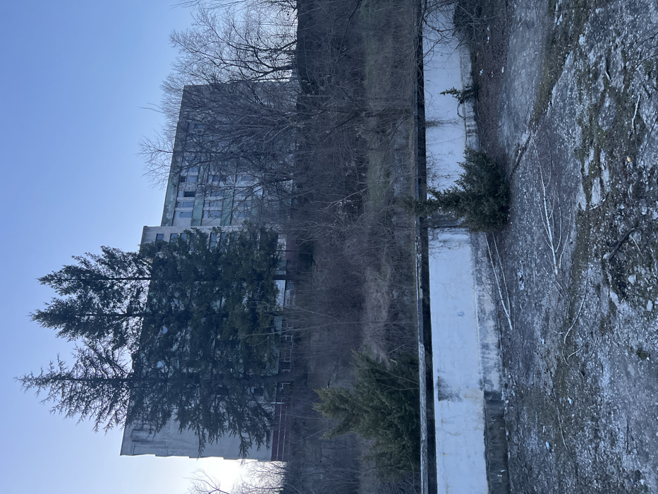 The image depicts a static outdoor scene in Ardino, Bulgaria, centered on a multi-story concrete building situated on a hillside. The building, possibly of Brutalist or post-socialist era architecture, exhibits a weathered facade with visible discoloration and darkened window apertures, suggesting neglect or abandonment. Multiple tall, dark green coniferous trees partially obscure the building's front and lower levels. The hillside leading up to the structure is covered in dense, leafless deciduous trees, sparse green undergrowth, and dry bushes, indicative of late winter or early spring. In the foreground, a prominent white-painted concrete retaining wall with a dark upper edge runs horizontally across the frame. Below this wall, the ground consists of an uneven, possibly cracked concrete or dirt surface, with scattered debris, dry organic matter, and small, bushy evergreen plants. The sky above is clear and light blue. No individuals, activities, or distinct interactions are present within the frame.