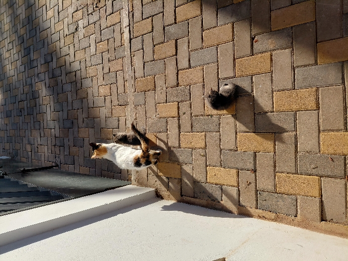 The scene depicts an outdoor paved area in Mohammedia, Morocco. The ground is composed of interlocking rectangular pavers arranged in a herringbone pattern, exhibiting shades of light brown, grey, and yellow. A white, textured wall runs along the left side of the frame, casting a sharp shadow onto the paving. A dark, vertical panel or structure is partially visible behind the wall in the upper left. Three domestic felines are present. An adult calico cat, predominantly white with black and orange-brown markings, is seated with its back to the viewer, facing towards the upper-left portion of the frame. A dark grey kitten is nestled closely against the left side of the adult cat. Approximately one meter to the right of the adult cat, a second dark grey kitten is observed curled tightly into a spherical shape on the paving stones. The area is under direct sunlight, evidenced by the sharp, elongated shadows cast by the cats and the wall.