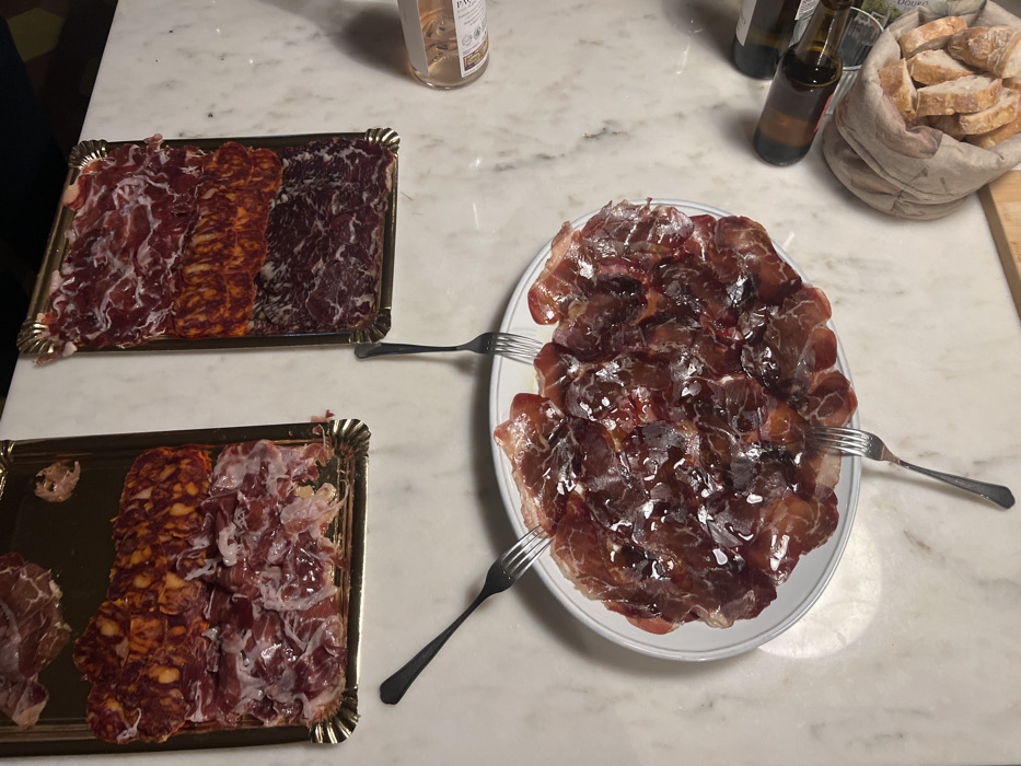 table laden with Spanish tapas. There are two rectangular trays, one with three sections of cured meats (likely chorizo and jamón), and another with two. A large plate is piled high with glistening slices of jamón, accompanied by three forks. A bottle of rosé wine, small beer bottles, and a basket of bread are also present. The marble tabletop adds a refined touch to the presentation.