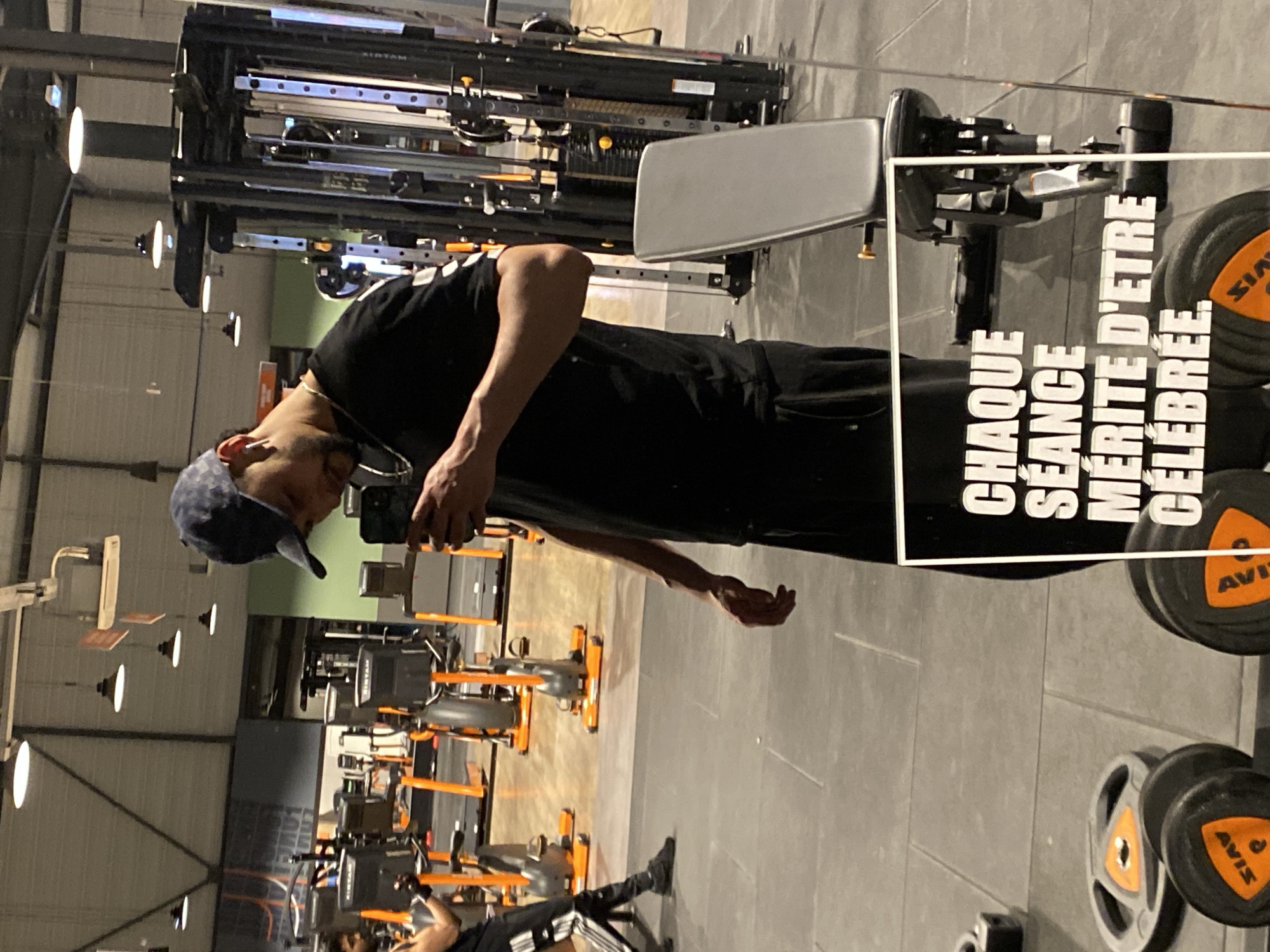 interior of a gym in Hœnheim, France. A man wearing a black shirt and a dark blue baseball cap is holding a mobile phone and taking a selfie. The gym has workout equipment, including weight machines and rows of orange and gray stationary bikes. A sign with text in French that reads "CHAQUE SÉANCE MÉRITE D'ÊTRE CÉLÉBRÉE" (Each session deserves to be celebrated) is positioned near the man. Dumbbells are visible on the right side of the image. The gym has a high ceiling with hanging light fixtures. Another person can be seen in the bottom left corner, partially obscured.