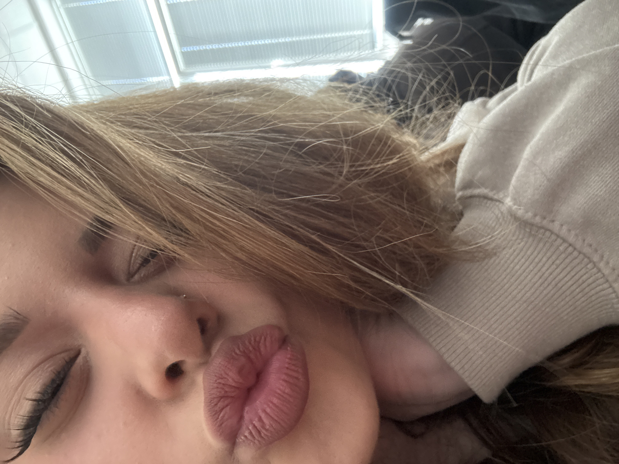 A close-up, tilted selfie depicts a woman with light brown hair, her eyes closed, making a puckered-lip kissing expression. She has a nose piercing. She wears a light tan or beige-colored hooded sweatshirt. The background includes a ceiling with linear, possibly fluorescent, lighting fixtures. The location is not discernible from the image.