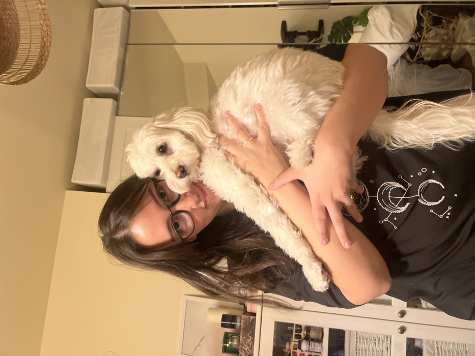 The image depicts an indoor scene in Ramat HaSharon, Israel. A female subject is centered, holding a small white dog. The female, with long, dark hair and black-framed eyeglasses, looks directly at the camera with a slight smile. She wears a black t-shirt featuring a white celestial design of crescent moons and star constellations. Rings are visible on her right ring finger and middle finger, and a darker ring on her left pinky finger. Her fingernails have light pink polish. The dog, a small breed with light cream-to-white, wavy fur, is held in the female's arms, facing the camera. Its gaze is directed forward. The background shows a domestic environment. To the left, a white cabinet with a glass-fronted upper section contains various small bottles and jars. Above this, a framed picture displays a minimalist landscape with birds. Decorative items, including candles, are on top of the cabinet. To the right, large white wardrobe doors, possibly mirrored, reflect parts of the room, including a basket with textiles and a green plant. Two white rectangular storage boxes rest on top of the wardrobe. A woven light fixture is partially visible in the upper right ceiling area. The walls are a light, neutral color.