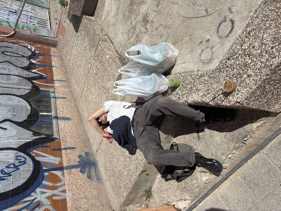An individual is depicted lying on a stepped concrete ledge in an urban environment in Tel-Aviv, Israel, under bright daylight conditions