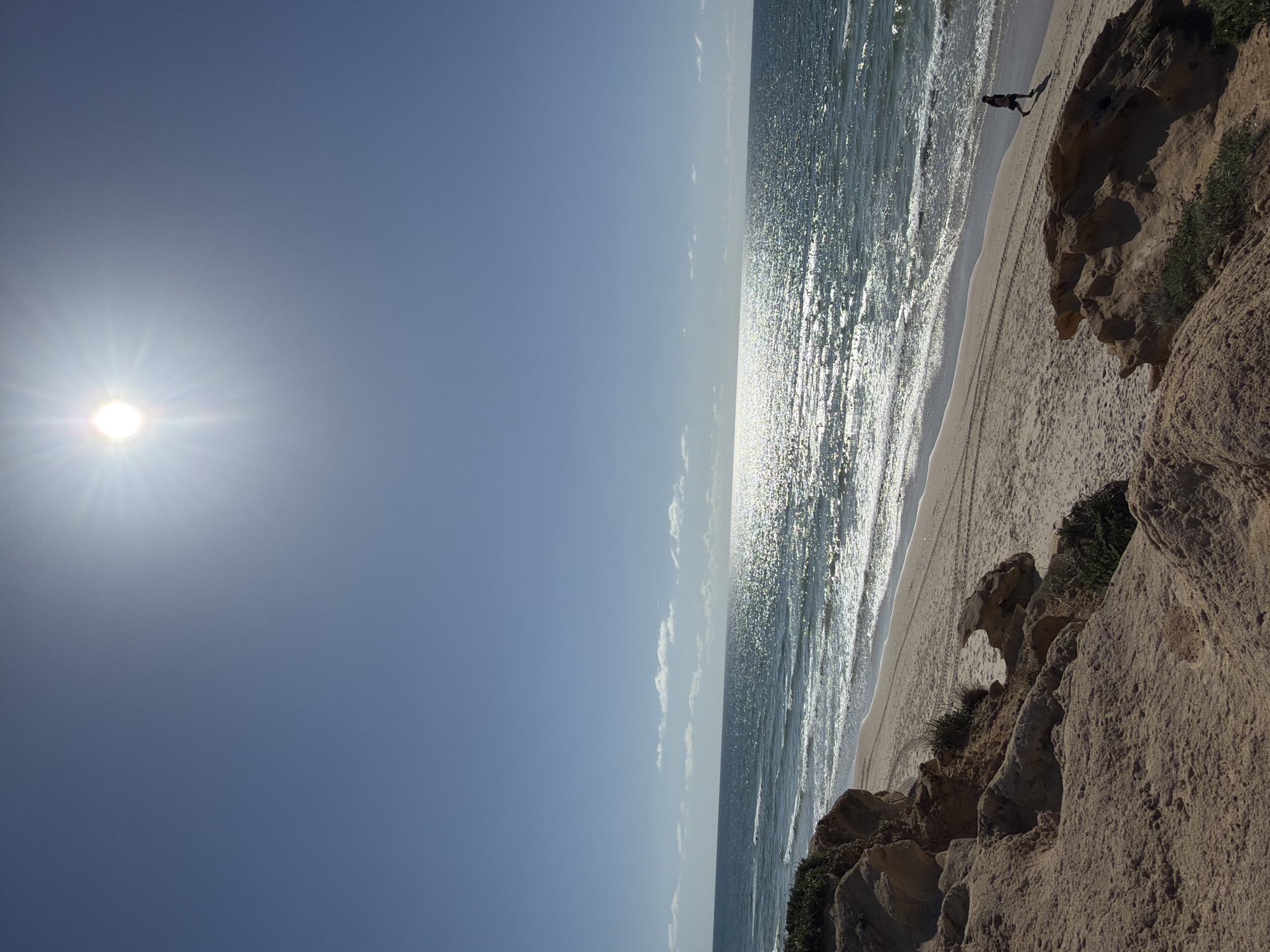 The image displays a sunny coastal landscape at Beit Yanai, Israel. The upper portion of the frame features a clear blue sky with the sun, appearing as a bright, starburst-like disc, positioned in the upper right quadrant. The Mediterranean Sea spans the mid-ground, its surface highly reflective from the sun, creating a shimmering path of light towards the viewer. Gentle waves break onto a light-colored sandy beach. A solitary figure, dressed in dark clothing, is observed walking from right to left along the water's edge on the sand. Parallel tire tracks are visible on the beach sand. The foreground and left side of the image consist of eroded, reddish-brown sandstone cliffs with sparse green vegetation growing on and between the rock formations.