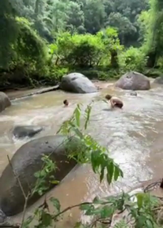 Two people are bathing in a shallow, fast-moving river