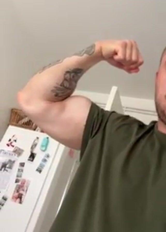 A fair-skinned man with a bald head and a short, full beard wearing a dark green t-shirt is flexing his right arm. The arm has a tattoo on it. He faces the camera and smiles, holding his arm with the flexed bicep to show off his muscle. In the background, there is a white refrigerator with pictures and notes attached to it, a woven basket on top of the refrigerator, and a white shelf unit. The walls are white.