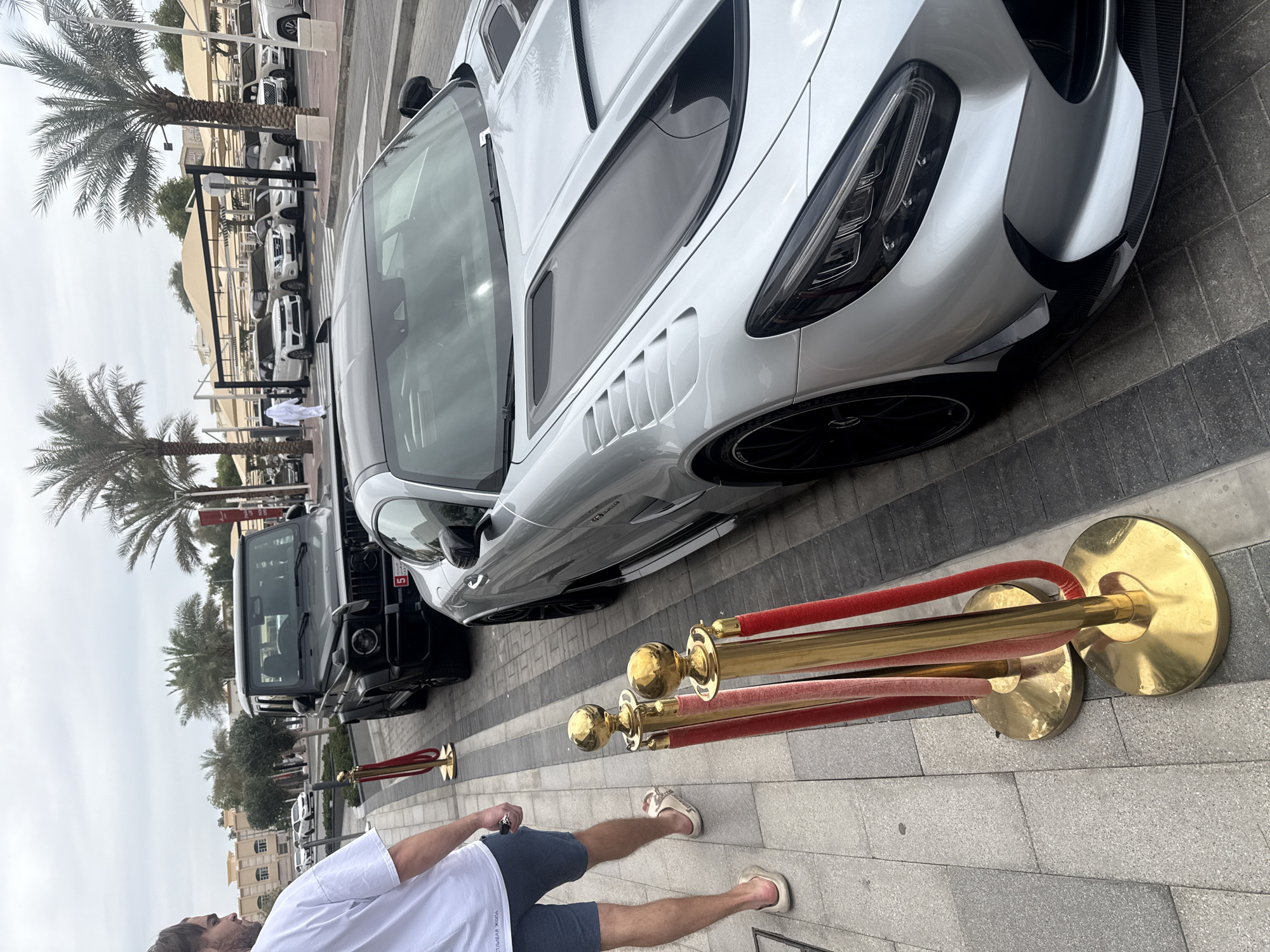 street scene in Al Jimi, United Arab Emirates, featuring a silver sports car parked next to a black SUV. A person is walking towards the cars, wearing a white shirt, blue shorts, and light-colored sandals. The area is lined with gold-colored stanchions with red velvet ropes. Palm trees are visible in the background, along with other parked cars and buildings. The sky is overcast. The ground is paved with rectangular gray tiles.