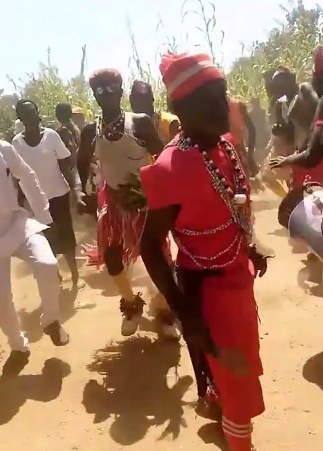 A group of people are performing a traditional dance in an outdoor setting. They are wearing vibrant clothing, including red, white, and orange outfits, adorned with beaded necklaces and fringed skirts. Some individuals also have hats or headbands. The dancers are moving in a circle, kicking up dust as they go. The background consists of trees and tall grass. The lighting suggests a bright, sunny day.