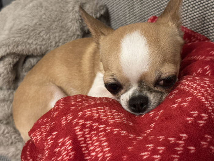 - "A tan and white chihuahua rests on a red blanket with a patterned design" by FM-eQUGe2, licensed under CC BY 4.0